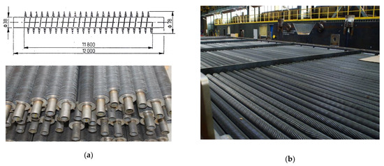Finned tubes with incised fins manufactured by Energoinstal SA, Poland (a) and a heat exchanger made of finned tubes–evaporator, Hattorf boiler (b).