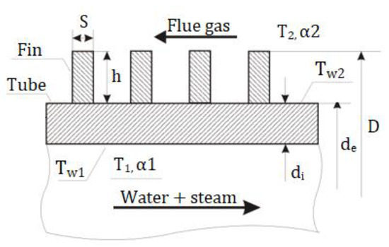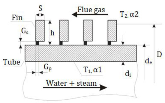 In modern gas boilers, such as water heaters, evaporators, and steam superheaters, welded finned tubes are used to increase the heat exchange efficiency (Figure 1) [1]. Due to the use of welded finned tubes in heat exchangers, gas blocks are characterized by very good electric energy production efficiency, and their reliability can reach 98% [2]. Welded finned tubes are usually applied where the heat transfer coefficients on the two sides of a barrier have significantly different values (e.g., flue gas and steam). The presence of fins on heat exchanger tubes increases the heat exchange surface even up to 30 times in comparison to non-finned tubes, leading to the heat exchange flux increasing by nearly 300% [1,3].