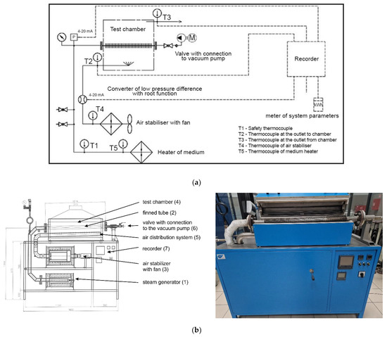 Diagram of the dedicated test stand for measuring the thermal performance of finned tubes: (a) conceptual design and (b) actual test stand built at Energoinstal SA, Poland.