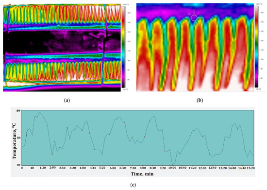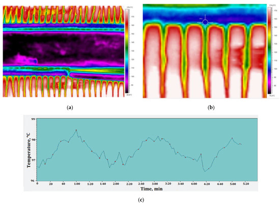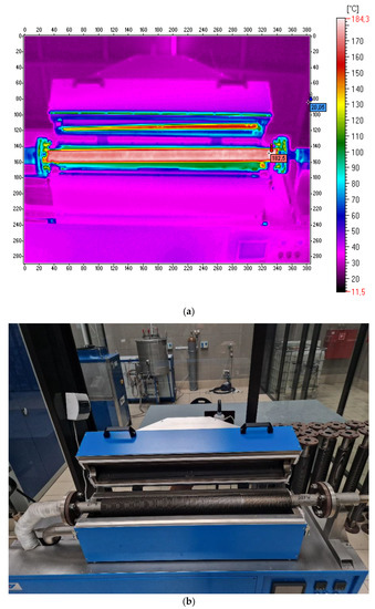 In order to confirm the uniform temperature distribution across the finned tubes, the temperature distribution was monitored during the experiment using a thermographic camera (Figure 4). On this basis, it was found that the designed and built test stand provided uniform temperature distribution across an entire tube and enabled the simulation of heat exchange in finned tubes.