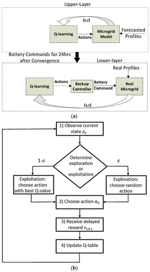 The recommended offline actions from the upper layer are passed to the second (lower layer) Q-learning, which are used as part of its state space. The lower-layer Q-learning updates the actions of the battery (charging, discharging, and idle) using knowledge of real-time data. It acts as a fine tuner for the battery actions based on the difference between forecasted data and real data. The lower-layer Q-learning runs and dispatches modified battery actions every 15 min regardless of the status of convergence. The modified battery actions form the lower layer are used by a real-time (backup) controller, which can override the actions to avoid over-/undercharging of the battery at the end of the 15 min interval. The flowchart below shows the Q-learning algorithm used by both upper and lower layers, as discussed in Figure 2a above.