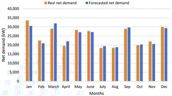 Figure 3 shows the variation between forecasted and real net demand on a monthly basis. It is evident from the figure that the total forecasted net demand per month is either higher or lower than the total real net demand per month, as indicated by the positive or negative values. In this regard, the deviation between forecasted and actual (real) net demand by month is tracked and is 10%, 7%, −9%, −11%, 4.5%, 1.9%, −5%, −2%, −2.5%, −2%, 6.5%, and 2.3% from January to December.