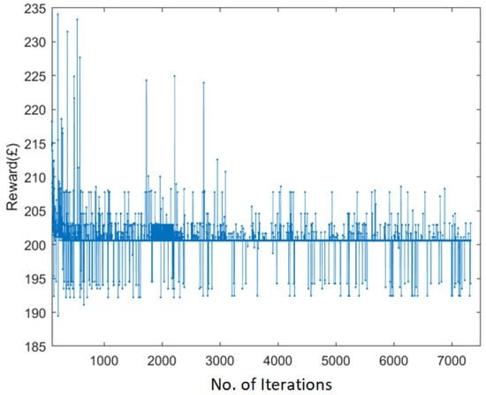In Figure 5, the average cumulative reward achieved by running the offline RL algorithm five times is observed. Every run starts showing a different cumulative reward, but towards the end, between 3000 and 5000 iterations, it starts to give the same cumulative reward, as shown in Figure 4. The average and standard deviations of all 3000 iterations are calculated after each run. The bars in Figure 5 show a similar cumulative reward for 1 day after 3000 iterations approximately. The average result of all five simulations in terms of a 1-day cumulative reward is GBP (£) 201. However, it shows variations during convergence expressed as standard deviations. The standard deviation for offline RL is shown to be between 3.7 and 4.4.