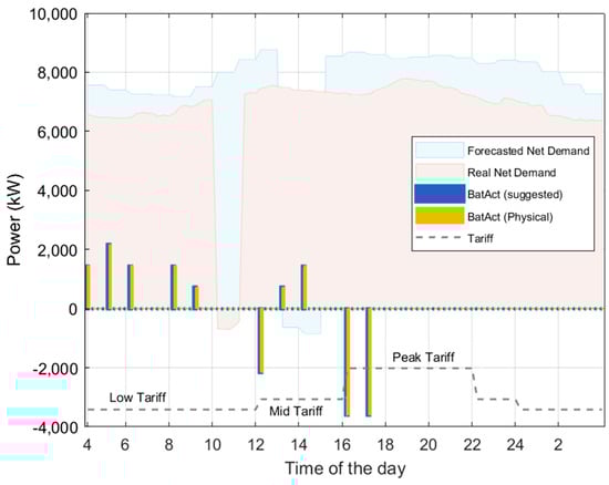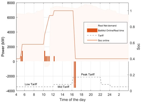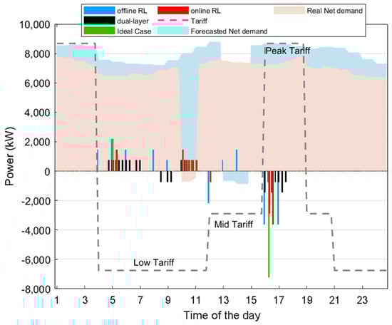 As mentioned above, the first layer is conducted offline to produce directive commands for the battery system for a 24 h horizon. It uses forecasted data for generation and load. The second Q-learning layer refines these battery commands every 15 min interval by considering the changes happening in RES and load demand in real time. Figure 9 shows the simulation results of the proposed dual-layer Q-learning. The upper offline layer commands would charge the battery between 13.00 and 15.00 during which forecast data suggest that an extra PV will be available. Additionally, it would discharge just before 12:00 to create some space within the battery for PV charge. It can be noticed that the lower layer made adjustments to the battery command, so the charging takes place between 10.00 and 11.00 during which a real extra PV is available. This shows how the suggested dual-layer strategy can improve performance according to real-time change in the net demand.