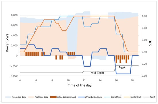 Figure 7 shows the simulation of offline RL. It shows that the extra forecasted PV is available from 13:00 and 15:00 as the net forecasted net demand is negative. However, according to real net demand, the extra PV is available between 10:00 and 12:00. As a result, battery optimal actions, based on forecasted profiles, are suboptimal as they charge the battery during the forecasted time for the extra PV not during the actual time when the PV is available.