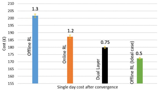 A 1-day performance comparison of the above strategies after convergence is shown in Figure 11. It shows that the proposed dual-layer strategy outperforms the online strategy, and its running cost is the closest to the ideal benchmark case. To test the stability, all four algorithms were run five times, and the standard deviation varies between 0.5 and 1.3. Figure 11 shows that the stability of the dual-layer RL approach is very close to the ideal case scenario when a standard deviation is considered, such as 0.75 and 0.5, respectively. Therefore, the performance of the dual-layer strategy is the closest to that of the ideal case scenario in terms of cost, convergence, and stability.
