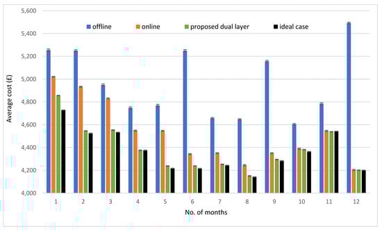 All four RL algorithms are tested on the 365 days of the year with varied predicted and real data profiles (net demand) to allow for a full comparison. The monthly costs are illustrated in Figure 12. The cost is calculated using Equations (6)–(8) and (13). It can be seen that the dual layer behaves approximately similarly as the ideal case scenario after 2 months in terms of monthly operating costs. The dual layer performed consistently throughout the year after convergence. In comparison with online RL, the early convergence of the dual layer means more cost reduction on a yearly basis.