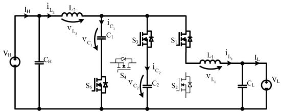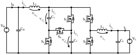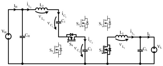 The BHSC, presented in Figure 2, can be seen as a modified bidirectional step-down (buck) converter, with a bidirectional switched-capacitor cell inserted at the high-voltage side. Compared with other high voltage conversion ratio converters, such as those described in [33,34], the BHSC has a common ground—a direct galvanic connection between the input and output ports—which is an advantageous feature in many applications. In terms of the number of components, compared with other topologies [30,35] with the same conversion ratio, the BHSC has an additional transistor, but it provides the advantage of smaller passive components, as shown in the following sections.
