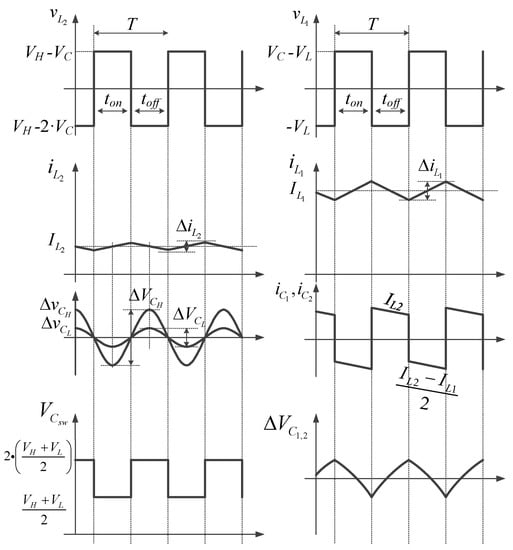 The key theoretical waveforms of the BHSC for the steady-state, step-down operating mode are presented in Figure 5. The relationships between the inductor currents iL1 and iL2, the inductor voltages VL1 and VL2, and the switched capacitor currents in the two switching states are in evident concordance with the above explanations and equations. The input and output voltage ripples (ΔVCH, ΔVCL) are represented considering ideal capacitors and constant current at the two ports.
