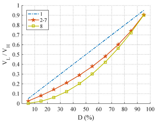 The relationship between VH and VL (i.e., the voltage conversion ratio, M), along with the duty cycle equation—both obtained from Equation (5)—are given as follows: