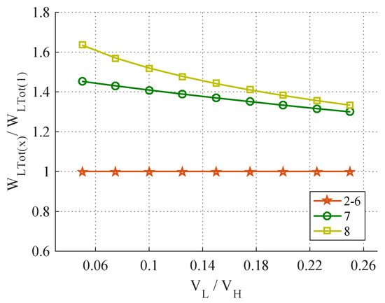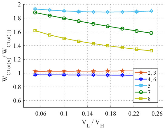 The voltages selected for comparison were VH = 400 V and VL = 20 V…100 V, in order to achieve a conversion ratio (VL/VH) between 5% and 25%. A common value for the inductor current ripple percentage was chosen, i.e., ri = 20%, or other optimal values can be used. Other topologies were selected for comparison, most with the same voltage conversion ratio together with a quadratic converter; their characteristics are presented in Table 1. From these results, it can be noticed that the BHSC converter achieves a conversion ratio between that of the conventional buck–boost converter (1) and the quadratic converter (8). In order to achieve this conversion ratio, the BHSC requires the same inductive and capacitive energies as the conventional converter, but lower compared with other topologies. The cost of achieving a common ground between inputs is seen in the total stress on the active switches, which is slightly higher compared with the selected topologies. The main characteristics of the selected converters are also presented in Figure 10, Figure 11, Figure 12 and Figure 13 in a more concise representation. The voltage conversion ratio VL/VH is multiplied with 100 in these figures.