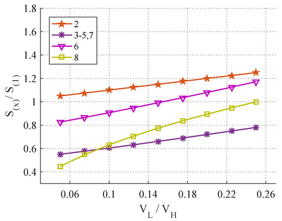 We used Equations (18), (22), and (25) to compare the BHSC with other topologies. The voltage conversion ratios are shown in Figure 6. The values of each compared converter were divided by the corresponding values of the conventional buck converter, and they are graphically represented in Figure 7, Figure 8 and Figure 9.