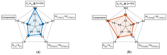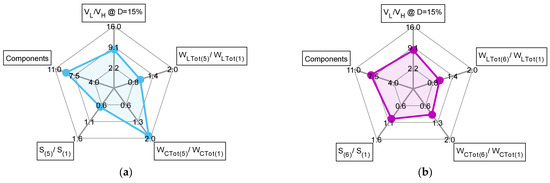 Radar chart with 5 axes: voltage conversion ratio (@D = 15%); number of components; total active switch stress; mean inductor energy; mean capacitor energy. (a) Chart of converter 5. (b) Chart of converter 6.
