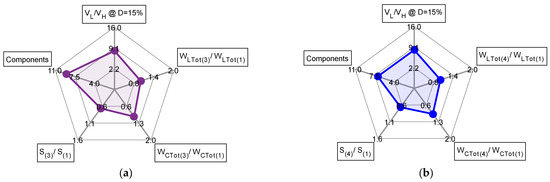 Radar chart with 5 axes: voltage conversion ratio (@D = 15%); number of components; total active switch stress; mean inductor energy; mean capacitor energy. (a) Chart of converter 3. (b) Chart of converter 4.