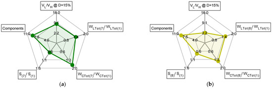 Radar chart with 5 axes: voltage conversion ratio (@D = 15%); number of components; total active switch stress; mean inductor energy; mean capacitor energy. (a) Chart of converter 7. (b) Chart of converter 8.