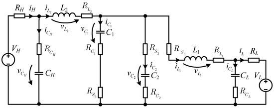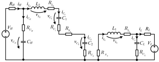 The energy stored in each capacitor is calculated using Equation (19), with the final expression as shown in Equation (20). The capacitors connected at the two ports (CH and CL) have equal stored energy, due to having the same parameter values and sizing equations.