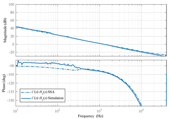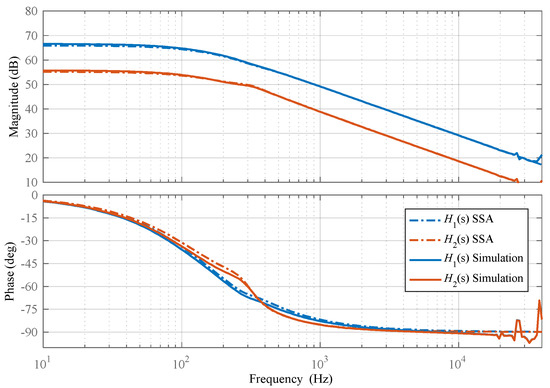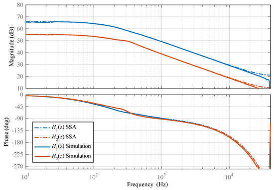 The block diagram of the control loop is presented in Figure 17. The Bode diagrams of H1(s) and H2(s) are presented in Figure 18. The transfer functions are discretized with the ZOH method, and a supplementary time delay is added to account for both PWM and ADC delay. The discrete transfer functions H1(z) and H2(z) are presented in Figure 19. The diagrams of the transfer functions obtained through the SSA method are compared with the diagrams obtained through digital simulations carried out on a BHSC switching model, including the digital controller (TMS320F28379D) for Figure 18, resulting in unnoticeable differences between them.