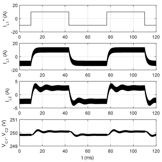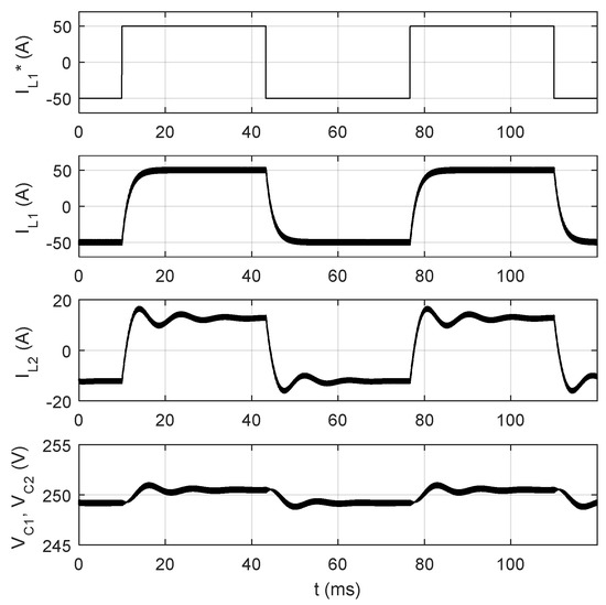 Digital simulations were carried out to check the stability of the system under various conditions. Selected waveforms are presented in Figure 21 and Figure 22. In Figure 21, a step change in the reference current from +50 A to −50 A was applied to test the behavior of the system under large step variation. The controlled current has no overshoot, and only low oscillations are present in the current of the other current. Small oscillations are also present in the voltages across the switched capacitors. In Figure 22, a step change in the reference current from +10 A to −10 A was applied, and a similar behavior can be observed. It is important to note that the transition from one operating mode to the other is very smooth.