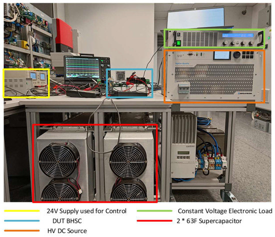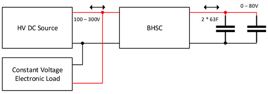 The experimental setup used for testing the BHSC prototype is represented in Figure 24, and a picture of the setup is shown in Figure 25. A constant voltage electronic load was connected in parallel to the HV source to ensure the bidirectional operation. When the BHSC enters the step-up mode, the electronic load is automatically activated and takes the current from the VH port. When the converter is operating in the step-down mode, the electronic load is kept in standby.