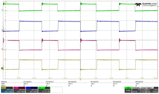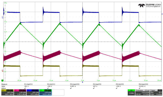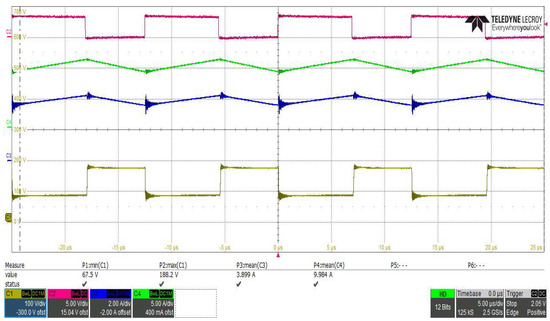 The first three results show key BHSC waveforms for steady-state operation. In Figure 26, the voltages across S3, S4, and S5 can be seen, together with the PWM driving signal for step-down operation at VH = 300 V and VL = 80 V, for a controlled current IL1 = 10 A. The interdependence between the PWM driving signal and the voltages on the three transistors corresponds to the description in Section 2. The voltage across the switched-capacitor cell, VCsw, is presented in Figure 27 for step-down operation at VH = 125 V and VL = 40 V, for a controlled current IL1 = 10 A. The two inductor currents are also displayed in the figure. The VCsw waveform can be compared to the theoretical waveform from Figure 5, which is similar; moreover, the correlation between iL2 and VCsw can be seen in both the theoretical and experimental waveforms. Figure 28 presents the currents through and the voltages across the two inductors for steady-state step-down operation at VH = 300 V and VL = 80 V, with a controlled current IL1 = 10 A. Some oscillations due to the PCB parasitic elements can be seen compared with the theoretical waveforms from Figure 5, which is common in power electronics.