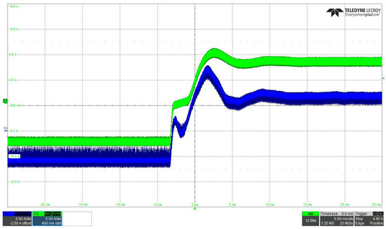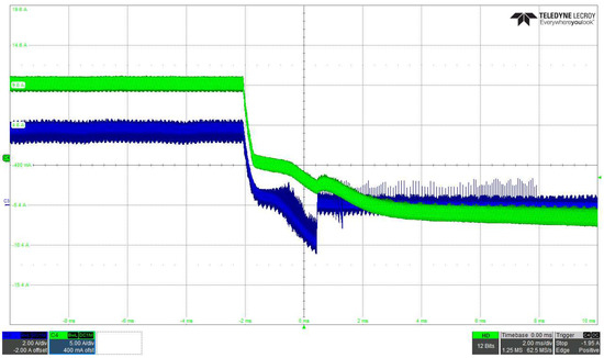 A transition from steady-state step-up operation at −10 A to steady-state step-down operation at +10 A is presented in Figure 29, for VH = 100 V and VL = 50 V. Figure 30 shows an inverse transition. The waveforms are similar to the simulation waveforms presented in Figure 22. The differences between the simulation and the experimental waveforms arise from the fact that at zero crossing of the controlled current, the BHSC prototype behaves slightly differently than its simulation model. There is a small overshoot of the controlled current and a fast damped oscillation—both completely acceptable—in Figure 29. A larger oscillation is present in the uncontrolled current (iL2), which can be resolved, if necessary, by advanced control techniques. For the step-down–step-up transition, the controlled current presents no overshoot, but a step change in the uncontrolled current can be seen, which can also be eliminated through advanced control techniques.