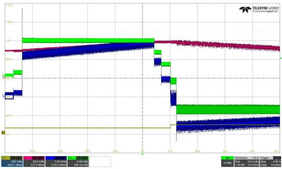 A series of experimental tests were carried out to investigate the behavior of the prototype under different operating conditions. During these tests, the high-voltage source output was adjusted in the range of 100–300 V, and the voltage across the supercapacitors was between 20 and 80 V. The experimental results are presented in Figure 26, Figure 27, Figure 28, Figure 29, Figure 30 and Figure 31.