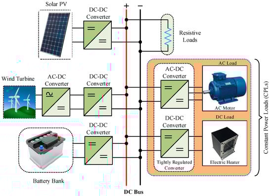 - Singh, S.; Gautam, A.; Fulwani, D. Constant power loads and their effects in DC distributed power systems: A review. Renew. Sustain. Energy Rev. 2017, 72, 407–421. [Google Scholar] [CrossRef]