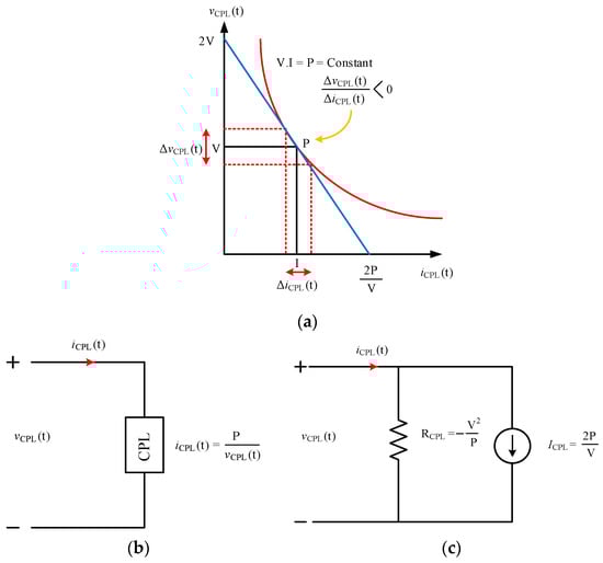 Tightly regulated POL converters behave as CPLs, exhibiting NII and posing significant instability challenges for DC MGs [,,,,,]. This can be explained as follow: if a disturbance causes the load voltage to fall below the voltage value of the stable point, the load current will be greater than the load current at constant power of the load, resulting in the discharge of the filter capacitor. As a result, the load current will rise to maintain the power constant but the voltage will fall.