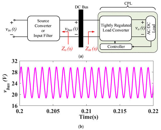 Power electronics converters are often designed and tested separately using just resistive loads [,,]. When an individually designed power converter is cascaded to other circuits, the stability properties of closed-loop converters designed as stand-alone devices are no longer preserved, and the system may exhibit unanticipated dynamic responses [,,,,,,]. Oscillation in DC bus voltage caused by CPL is depicted in Figure 3b. Because of impedance interactions between the source-side and load-side converters, voltage response oscillations occur.