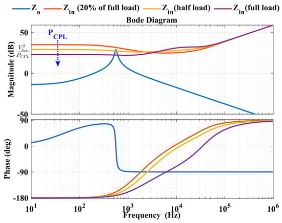As we can observe in Figure 4, if the output impedance (i.e., LC input filter) resonance frequency is inside the closed loop bandwidth of the CPL’s input impedance, in such a circumstance, instability occurs beyond the threshold power of the CPL. The threshold power expression is calculated by (17) [,].