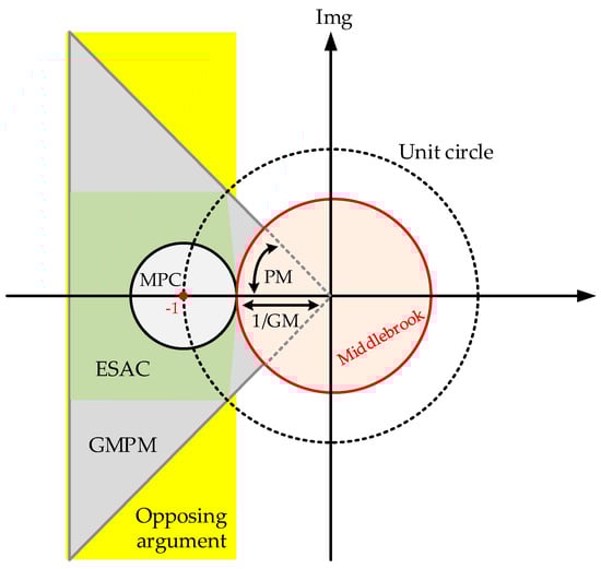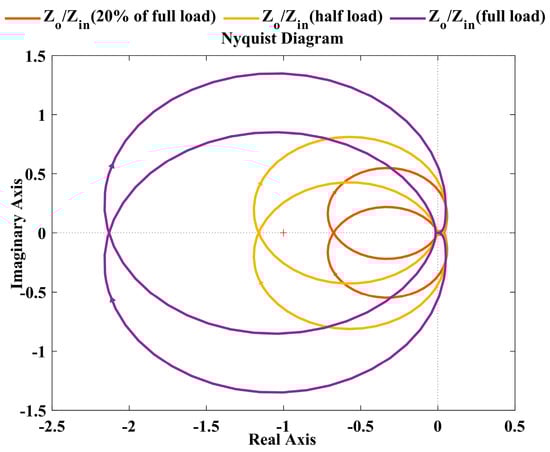 Various methods have been developed for small-signal stability analysis of the power electronics cascaded system. These methods are based on eigenvalue methods or impedance-based methods [,,,]. For detailed systematic analysis, the eigenvalue technique is preferred because it has advantages in finding oscillation modes and instability roots of system variables. However, to carry out a stability analysis, it is necessary to have access to all system data, which varies between suppliers and may be kept private [,]. In an impedance-based method, a system is separated into a source equivalent and a load equivalent, and system stability is assessed using the Nyquist criteria by comparing the impedance ratios of the source and load. As a result, it is appropriate for examining how different subsystems interact as well as for converter design. The impedance-based method also includes a black box capability, which makes it a powerful tool for online stability study or when system information is unavailable []. However, some impedance stability criteria may result in a conservative design due to their conservatism, which makes it difficult to determine the oscillation modes and participation components [,,,]. As can be seen in Figure 5, numerous stability criteria for DC systems based on forbidden regions for the minor loop gain have been presented in the literature to assess overall system stability. These include the Middlebrook Criterion [] and its different extensions, such as the gain and phase margin (GMPM) criterion [], the opposing argument criterion [,,,], the energy source analysis consortium (ESAC) criterion [,] and the maximum peak criterion (MPC) [,]. The system stability can be predicted with the help of impedances, by observing the nature of using the minor loop gain criterion [,,,]. The cascaded system is stable according to the minor-loop gain criterion, if and only if the Nyquist contour of does not encircle the critical point (−1, j0) in the complex plain. Figure 6 is plotted by using the parameter given in []. From Figure 6, it can be observed that a Nyquist plot of does not encircle the critical point (−1, j0) at 20% of full load, but it does encircle at half of the full load and at full load.