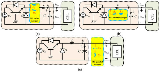The damping of a system can be improved by adding passive elements such as a resistor (R), an inductor (L) and a capacitor (C), or any combination of these [,]. Different types of passive damping stabilization techniques have shown in Figure 8. Adding passive damping to a system is a simple way to increase its damping. The improvement is due to changes in either the cascaded system’s source converter’s output impedance or the load converter’s input impedance. To stabilise the system, the authors of [] proposed an RC parallel damper to overcome the NII of the CPL and the input LC filter. Moreover, the rise in rated voltage increases the chance of capacitor failure in passive damping [].