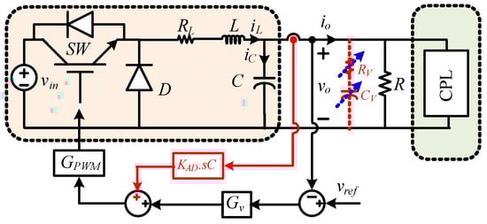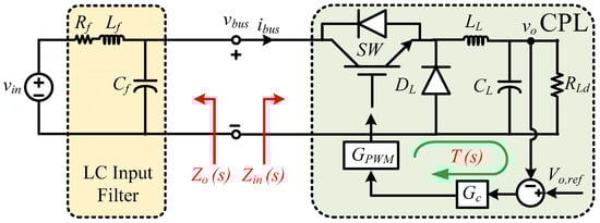 When the source side of a cascaded system consists of an LC filter or an uncontrolled converter with no closed loop, active control strategies on the source side cannot be employed to increase system damping []. In such circumstances, there are two options for CPL compensation: one is CPL side compensation and the other, use of an active shunt damper between the feeder and the load subsystems. Active damping techniques based on CPL side compensation will be reviewed in this section. To meet Middlebrook’s stability criteria, these techniques adjust the CPL control loops’ input impedance by injecting a compensating current or power. The main issue with this strategy is that the dynamics of the extra compensating loop may disrupt the primary control loop of CPL, resulting in a trade-off between load performance and stability margin. On the other hand, this method is beneficial because CPL itself is used to reduce the negative impedance instabilities. In [], authors proposed a CPL-side active damping control in which virtual impedance is inserted to damp the oscillation caused by CPL. The cascaded system used in this work is shown in Figure 14. The output impedance of the LC input filter is given in (14) and input impedance can be expressed as (15), where , , D, are the open loop input admittance, control-to-output voltage transfer function, duty cycle and loop gain of the voltage loop of the CPL converter, respectively.