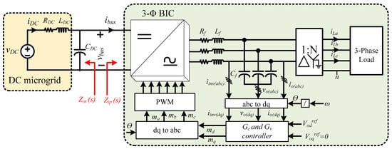 A typical DC-coupled hybrid microgrid is reported in the literature [] as depicted in Figure 15. Because the power consumed from the DC bus is constant for a given AC load, the bidirectional interlinking converter (BIC) appears as CPL to the DC bus during the islanded mode of operation. As a result, voltage oscillation at the DC bus interface of the BIC occurs due to impedance interaction (i.e., interacts with ) [,]. In [], a control strategy based on active damping is suggested to address the aforementioned CPL instability without impairing the BIC’s AC voltage regulation performance. However, the implementation of this control method requires six AC sensors, which increases the capital cost of the BIC. The output impedance ( and the input impedance ( can be expressed as follows: