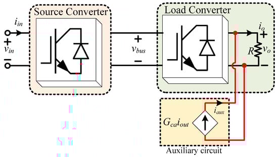 In this strategy, an extra circuit is added between the source and load subsystems to mitigate the effect of CPLs, while the source and load subsystems remain unchanged. This auxiliary circuit is often a regulated DC-DC converter as seen in Figure 16 that injects the required compensatory current over the entire operating range of the main system []. However, this method eliminates the challenges of the previous two approaches (i.e., source side and CPL side). While it increases the overall complexity of the system, it also imposes additional cost and power losses. In [], the authors proposed an auxiliary circuit active damping method which is connected to the output of the load side converter as depicted in Figure 17. It improves the transient performance of the cascaded system. However, the implementation is complex and also imposes an extra cost.