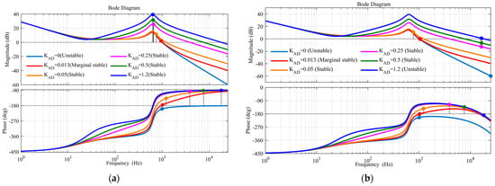 From (23), , which may be responsible for the delay of half of the sample time. These delay effects are incorporated in the control loop of the digitally controlled converter by cascading (for PWM delay) and (for computational delay) blocks. By combining the abovementioned delays, the net delay in the digital control system can be considered as . The bode plot of the open-loop gain of a buck converter with the parameters given in [] is shown in Figure 18, where, is the gain of the active damping controller and its minimum value (i.e., ) is calculated by using (13). In Figure 18a, for , the system is approaching the marginal stability scenario. Increasing improves the phase margin of the system, indicating an increase in system damping as shown in Figure 18a. In this way, the stability of the closed-loop control system is ascertained. Figure 18b shows that, while considering computational and modulation delays, increasing by a specific amount gradually reduces the system’s phase margin until the system becomes unstable. This implies that must have a stable range between . The stable range of can also be increased by decreasing . can be easily calculated by solving the (24) and (25) [,]: