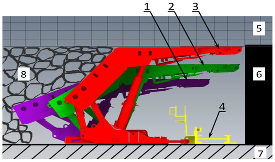 In hard coal mining, the development of powered roof-support complexes is crucial [56,57,58,59]. A longwall complex is a set of machines constituting the essential equipment of a mining wall. It is used to mechanize the process of mining, loading, and transporting the product. The interdependence of construction and movement characterizes machines in the wall complex. The primary function of the wall complex is to achieve the required performance while maintaining safety. The powered wall complex includes a powered roof support, a scraper conveyor and a mining machine. In this work, the authors focus mainly on the development of the powered roof support. Recent research on the development of powered roof supports can be found in [60,61,62,63].