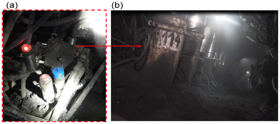 The extraction wall in which the research was carried out, where: (a) the measurement system with a prototype double block was installed on a prop; (b) view of the section on which the research was carried out.