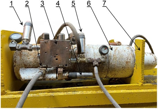 View of the test bench for verification of the double block charging function, where: 1—pressure sensor for the supra-block space, 2—pressure charging, 3—double block with pressure charging, 4—safety valve, 5—pressure sensor for the sub-block space, 6—hydraulic prop, 7—frame of test site.