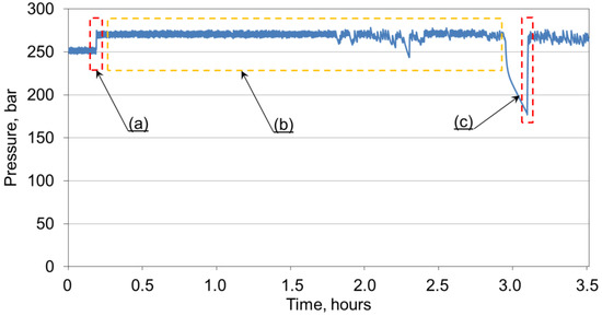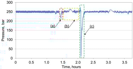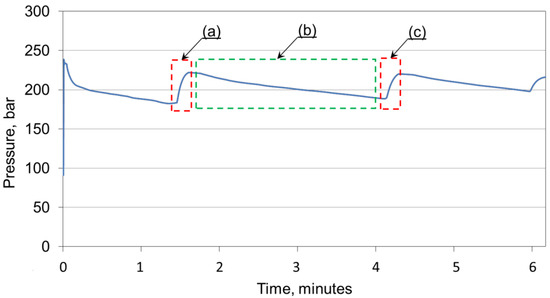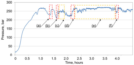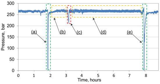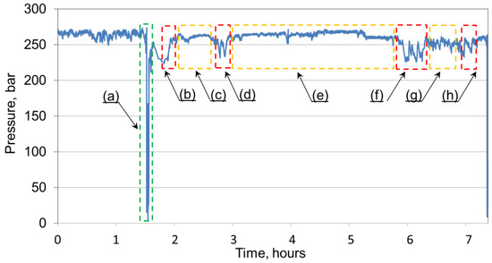 Figure 6 shows the analysis of the charging time, where four boosts of pressure were obtained. The first charge (a) was 1.9 min. The second charging started after 11.7 min and reached time (b), which was 2.4 min. For the subsequent charging (c), the maintenance time of the working load capacity of the powered roof support was 15.9 min. In the graph (Figure 6), the third charging (d) reached a time of 5.0 min. The working load capacity between the third and fourth charging (e) was 95 min. However, the fourth charge in graph (f) was captured within 1.2 min.