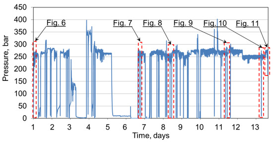 Figure 5 shows the measurement obtained from the actual conditions of the mining wall. This figure shows a section of measurements from about 12 research days. The average pressure under the piston of the hydraulic prop was up to 30 MPa, and was mainly related to the pressure of rock layers on the powered roof support. To fully illustrate the measurement for the operation of the hydraulic system with a double block, Figure 5 has been divided into individually selected fragments of the operation of the double block with charging. The measurements presented in Figure 5 were analyzed, consisting of the selection of several work areas of the block charging. The mining and geological conditions as well as the pressure of the layers of roof rocks were omitted. The focus was solely on the analysis of the pressure charging function.