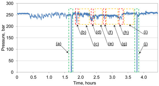 Figure 8 shows a graph of the obtained measurement for the charging function. The analysis considers the time of moving the section, which was (a) 2.2 min. After which, the first pressure charging time was recorded (b = 54 s). Maintaining the working load capacity (c) lasted about 24.4 min. On the other hand, its decrease caused a pressure charging which lasted about (d) 1.4 min. The working load capacity between the second and third charging was maintained within (e) 20.7 min. The third pressure boost was about (f) 50 s. On the other hand, the working load capacity was maintained for about (g) 23 min. The fourth charging took about (h) 22.5 s, after which, the working load capacity was maintained for the time of (i) 28.2 min. The analysis of the charging function was completed by moving the section to a new position, which took (j) 1.2 min.