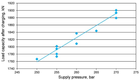 Based on Formula (1), the load capacity values for the tested prop were calculated. The temporary load capacity values were calculated for when the pressure drop occurred (FR), and for after the pressure charging (FRD). The results are recorded in Table 3 and shown in Figure 12 and Figure 13. The research results suggest that a double block with a charging function ensured that the required working load capacity was maintained at a minimum level of 1766 kN. As a result of charging, the actual load capacity of the prop increased by about 10–20% in relation to the load capacity before charging. At higher pressure losses, the increase in load capacity after charging reached up to 50%. After charging, the prop’s load capacity was directly proportional to the temporary pressure in the main power line. The results of real tests confirmed the results obtained in bench tests [65].