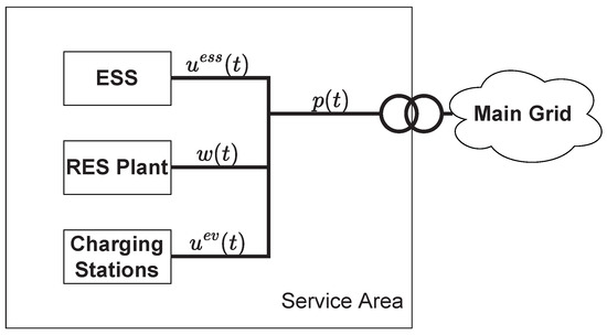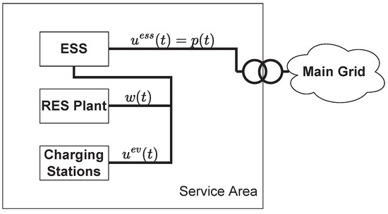 where u ^ e v ( t ) is the cumulative power demand of the charging PEVs. The introduction of variable u e v ( t ) to control the charging power delivered to the PEVs, which may differ from the power demand, u ^ e v ( t ) , adds an additional degree of freedom to the system. Moreover, it is worth noticing that u ^ e v ( t ) and w ( t ) are considered unknown disturbances for the system, for which it is assumed that their expected values are E [ u ^ e v ( t ) ] and E [ w ( t ) ] .