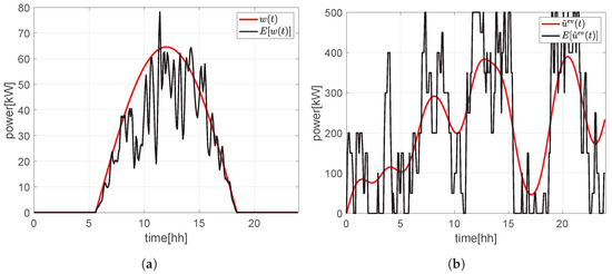 Figure 3. The curve w ( t ) and u ^ e v ( t ) chosen for the simulations. The black line represents the expected values of E [ w ( t ) ] and E [ u ^ e v ( t ) ] in (a) and (b), respectively; the red line represents a realization of the actual curve w ( t ) and u ^ e v ( t ) in (a) and (b), respectively. (a) Curve w ( t ) chosen for the simulations; (b) The curve u ^ e v ( t ) chosen for the simulations.