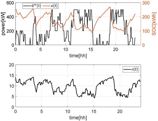 Figure 4. Evolution of cost c ( t ) based on PEVs’ power demand and ESS SOC.