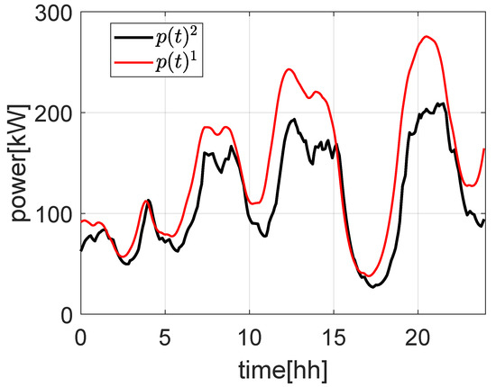 Figure 6. Power evolution at POC. p ( t ) 1 is computed with fixed c = 15; p ( t ) 2 is computed with c(t), as in (15).
