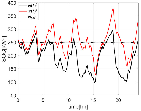 Figure 7. ESS SOC evolution. x ( t ) 1 is computed with fixed c = 15; x ( t ) 2 is computed with c(t), as in (15).