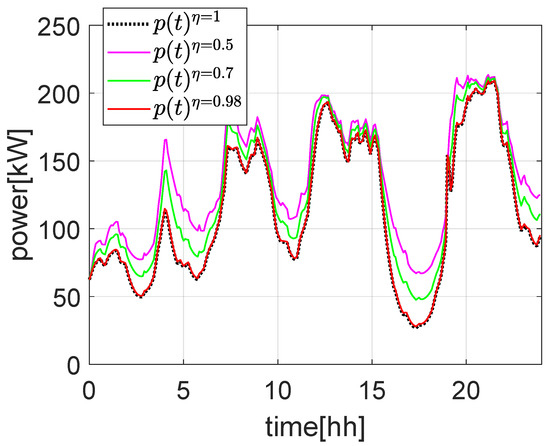 Figure 8. Power evolution at POC with different power conversion losses factors η { 0.5 , 0.7 , 0.98 , 1 } .