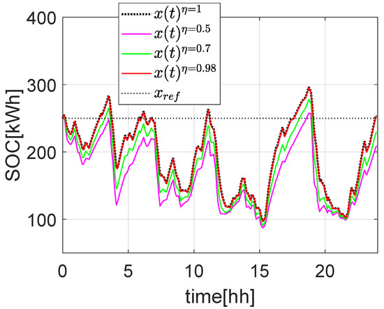 Figure 9. ESS SOC evolution with different power conversion losses factors η { 0.5 , 0.7 , 0.98 , 1 } .